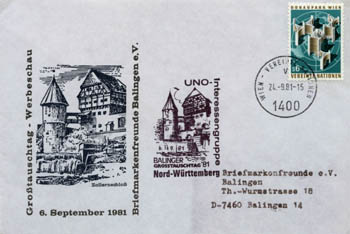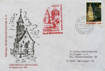 "Post von den Vereinten Nationen" so lautete das Motto des Großtauschtages 1981. Bei der anwesenden UNO - Interessengruppe konnte man seine Belege mit einem AIR - Mail - Stempel (Luftpost) versehen, die mit einer UNO - Briefmarke freigemacht wurden und anschließend per Luftfracht nach New York geschickt wurden. Dort wurden die Briefe beim Postamt der Vereinten Nationen eingeliefert, gestempelt und gingen dann an die Empfänger zurück. Zu diesem Anlass wurden vom Verein Belege mit kleiner Auflage herausgegeben. |
