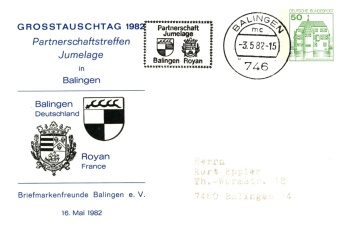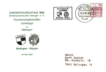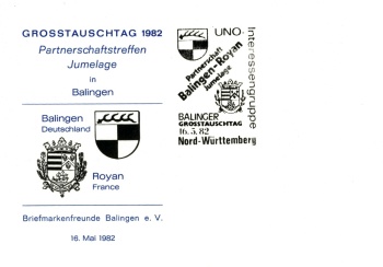 | Für den Großtauschtag, der am Sonntag den 16.Mai 1982 stattfand, konnte erneut die Agentur der Vereinten Nationen Wien gewonnen werden, die Sammlerpost des Sammlegebietes UNO annahm und diese zur Abstempelung und Rücksendung via Wien, Genf und New York weiterleitete. Diese Post bekam außerdem einen besonderen Handnebenstempel mit den Emblemen der Partnerstädte Balingen und Royan. Außerdem wurden zwei Ganzsachen mit Hinweis auf die bestehende Jumelage aufgelegt. | ||||||||||||||||||||||||||||||||||||||||||||||||||||||||||||||||||||||||||||||||||