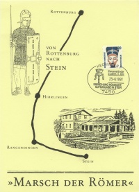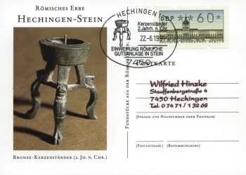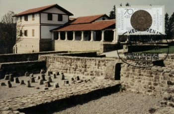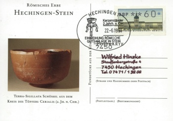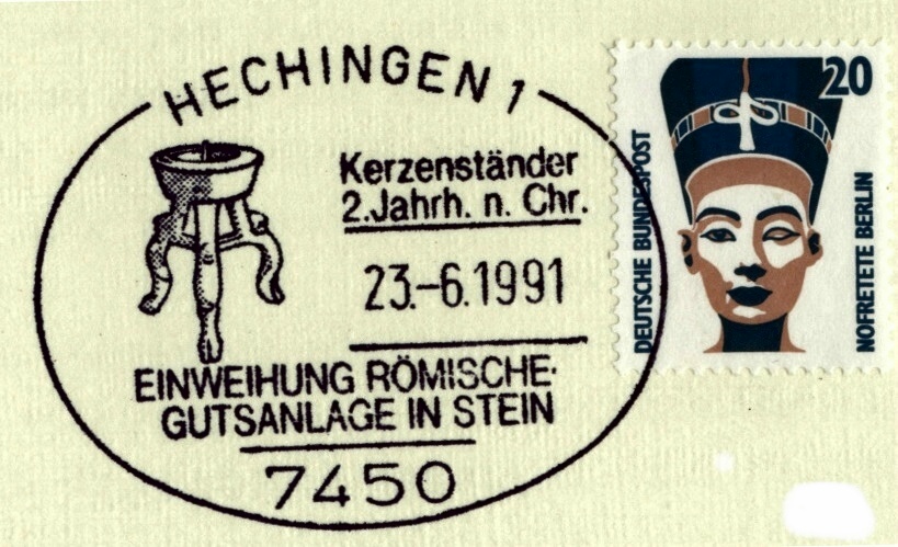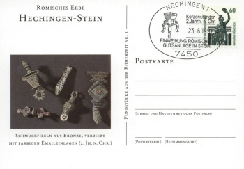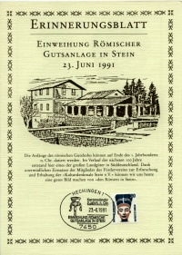 Zur Einweihung des Freilichtmuseums hatten die Briefmarkenfreunde Balingen e.V. in Zusammenarbeit mit der Post und dem Förderverein Hechingen - Stein am Samstag und Sonntag bei der Villa rustica in Stein ein Sonderpostamt eingerichtet. Die Sammlerfreunde aus Balingen ließen einen Sonderstempel zur Feier des Tages anfertigen. Den amtlichen Sonderstempel gab es auf besonders geschmackvoll gestalteten, farbigen Postkarten, Falt- und Schmuckblättern, die Ausgrabungsfunde vom Gelände der Villa rustica zeigen. | |