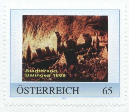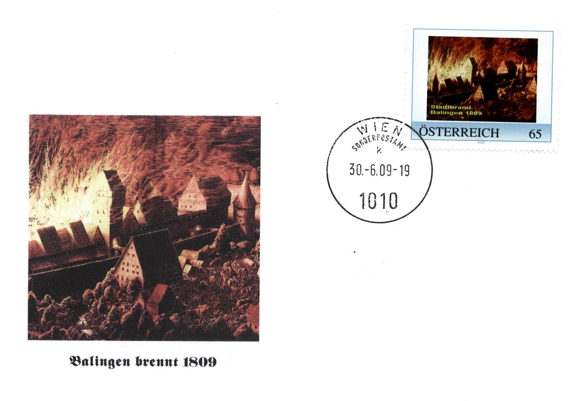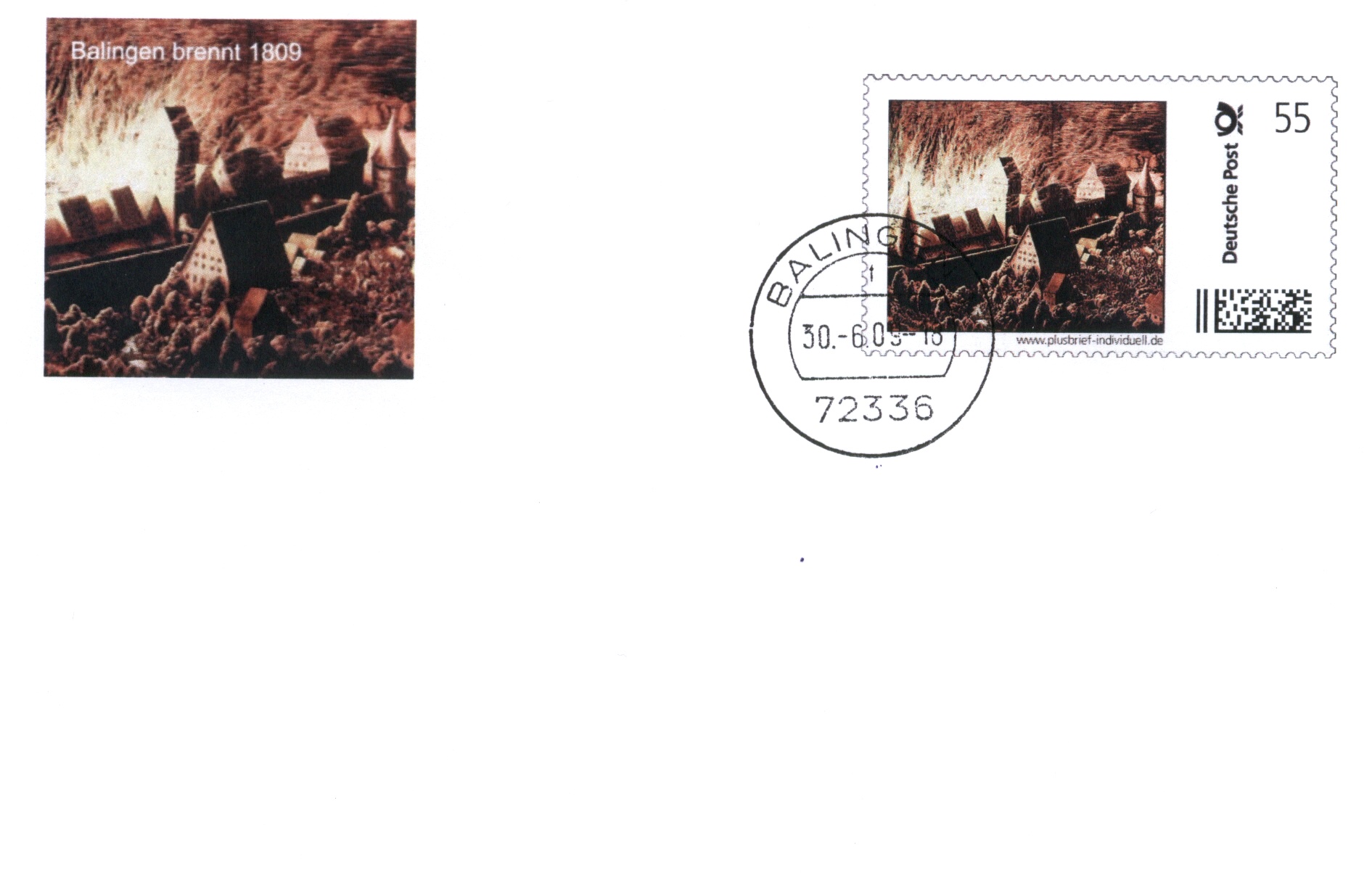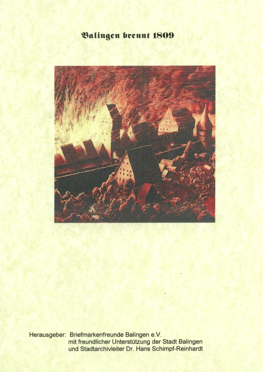 Am 20./21.Juni wurde der historische Anlass in Balingen gefeiert, das historische Datum des Stadtbrandes war der 30. Juni 1809. Zu diesem historischen Anlass hatte der Verein verschiedene Erinnerungsbelege, nach dem Motiv des aus Geislingen stammenden Künstler Stefan Kübler aufgelegt. | ||||||||||||||||||||||||||||||||||||||||||||||||||||||||||||||||||||||||||||||||||||